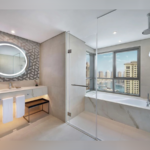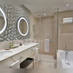 Luxury marble flooring and interior marble finishes for Hilton Panorama hotel suite in Doha with premium hospitality standards.